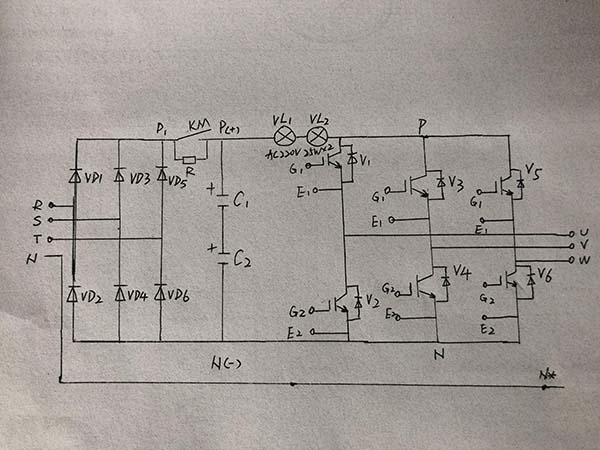 將三相U、V、W輸出端對三相供電的零線(N*)測量,U相,W想直流成分為零,而V相約有-300V的直流負(fù)壓。由此判斷:V相下臂導(dǎo)通良好,而上臂導(dǎo)通不良,兩臂輸出的正,負(fù)半波不對稱,致使V相對零線有負(fù)電壓輸出。而V相上臂,恰巧就是新?lián)Q上的模塊。另購一只相同型號模塊更換后,三相輸出正常。模塊的故障,為內(nèi)部輸出管C、E極間導(dǎo)通內(nèi)阻變大。說明了一件事,即使是細(xì)致測量后,認(rèn)為是好的逆變模塊,也不能百分百斷定就是沒有問題的。萬用表的測量判斷能力畢竟有限的。對接入電路上電后反映出的問題,不要存有先入之見,認(rèn)為模塊不可能是壞的,從而造成對故障的誤判,合檢修走入彎路。